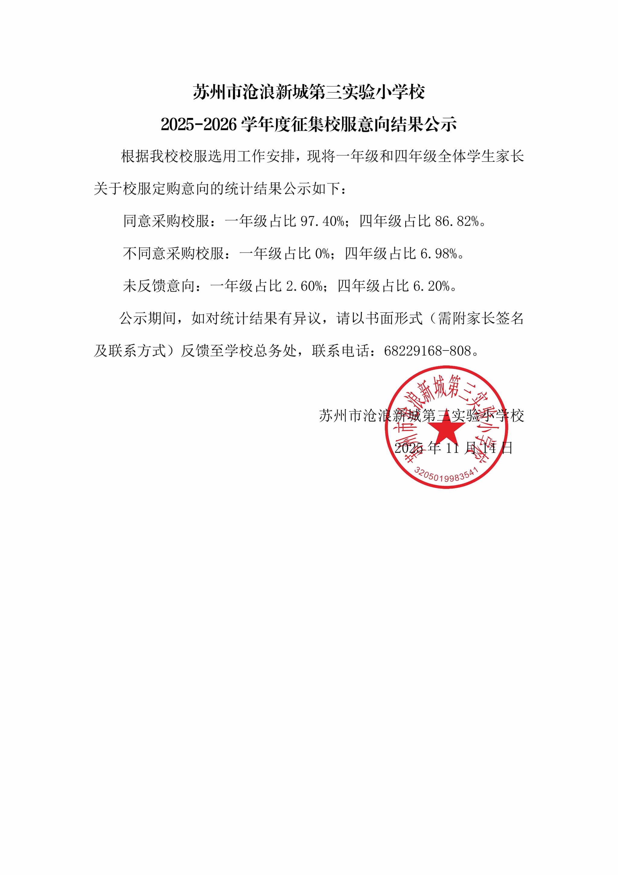 苏州市沧浪新城第三实验小学校 2025-2026 学年度征集校服意向结果公示